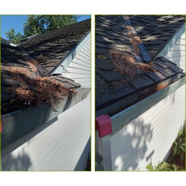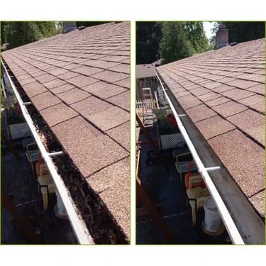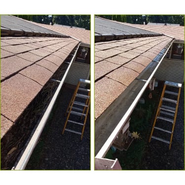 In order to keep your gutters functioning properly and looking good I remove the bulk of the debri by hand from the gutter tracts, I then unclog and clear out the downspout and wash out the gutter tract, i then clean the exterior as well.